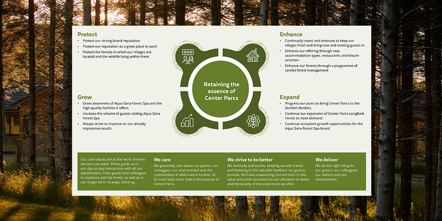 Client collaboration was central to the outcome. Building on the recommendations, the client further developed their people narrative with additional visuals and colleague quotes. This brought authenticity to the storytelling and reinforced Center Parcs’ commitment to its employees and communities.
