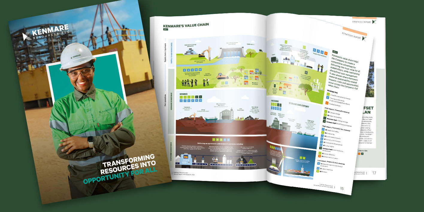 Kenmare Resources’ 2024 Annual Report sets a new benchmark for how small-cap companies can integrate complex regulation with clarity and confidence. As one of the first in its category to adopt the Corporate Sustainability Reporting Directive (CSRD), Kenmare chose not to append compliance but to embed it within the core of its printed report. Through close collaboration between content and design teams, we introduced an intuitive CSRD Index system, visualised double materiality with a clear heat map, and redesigned the business model and value chain spreads to align with ESRS standards. Every disclosure was traceable, accessible and strategically placed without inflating the document. The result is a refined, multi-audience report that blends creativity with compliance. It has been praised by regulators, analysts and internal stakeholders alike, and has helped position Kenmare as a responsible, forward-looking small-cap with a clear purpose and a confident voice in a changing regulatory landscape.